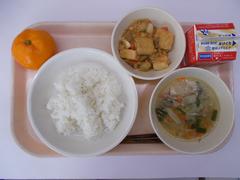 今日の給食は「ごはん、豚肉と生揚げの炒め煮、野菜スープ、みかん、牛乳」