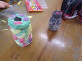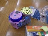 図工 「空きようきのへんしん」カップやペットボトルなどを紙粘土で飾って、貯金箱やペンケース、小物入れなどの素敵な作品ができあがっていました。