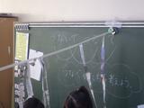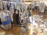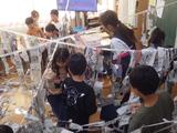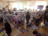 図工 つないでつるして 細く切った新聞紙をつなげたりつるしたりして、教室を飾っていました。