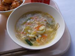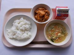 今日の給食は「ごはん、生揚げの四川煮、野菜スープ、牛乳」