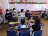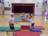 体育 跳び箱を使った運動遊びをしています。手を奥の方に着くことや手でしっかり身体を支えることができて、上手に跳べるようになっていました。
