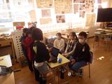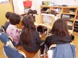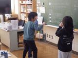 理科 音の性質について、糸電話を使って確かめています。糸電話の間の糸を指で軽く触り、友達が話したときにふるえることに驚いていました。