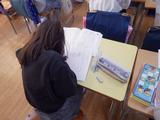 理科 音の性質について、糸電話を使って確かめています。糸電話の間の糸を指で軽く触り、友達が話したときにふるえることに驚いていました。