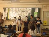 外国語 様々な職業の言い方を練習しています。代表者が、自分がなりたい職業を一斉に言うゲームでは、耳を澄ませて真剣に聞いていました。