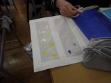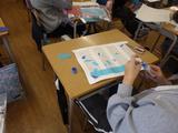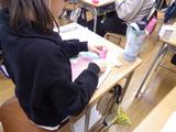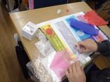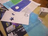 図工 紙で作った円柱や四角柱の中にライトを入れて、ランプシェードのような作品を作っています。完成したときの光や影を想像しながら飾り付けています。