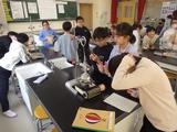 理科 水の温まり方を確かめる実験をしました。だんだん泡が出てくる様子に驚きながら、変化と温度の関係を考えていました。