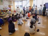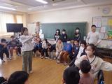 【1年生】ホールに張ったたこ糸に自分の作品をクリップで引っ掛けて走らせています。友達と一緒に走らせたり、自分の作品を追いかけたりして楽しんでいました。