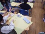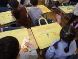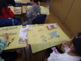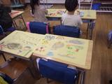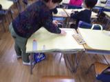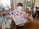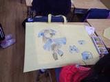 今までの作品を持ち帰るための作品バッグの用意をしています。クレパスで思い思いの絵や字を楽しそうに書いていました。