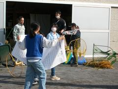 田植えから育ててきた稲がしっかり実りました。刈り取った稲は体育館2階の手すりにかけて干しました。
