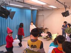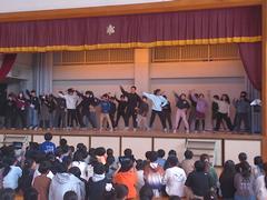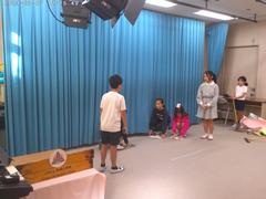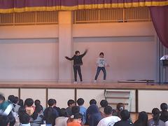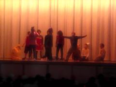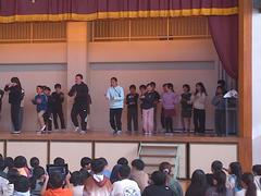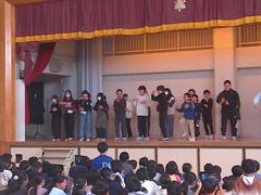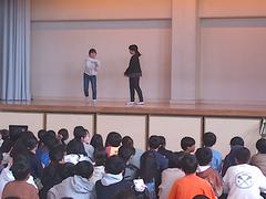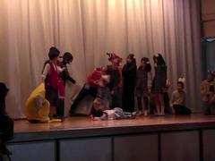 6年生の劇です。お面やかぶり物等をつけて演じていました。