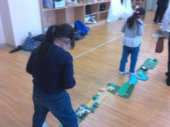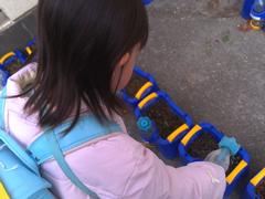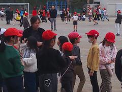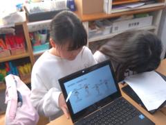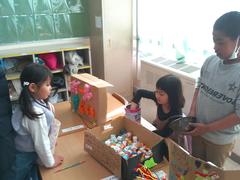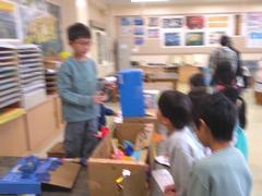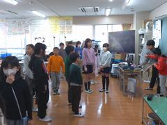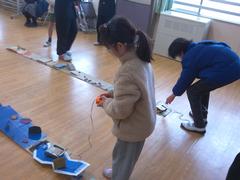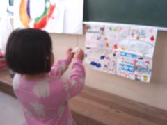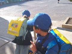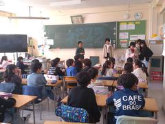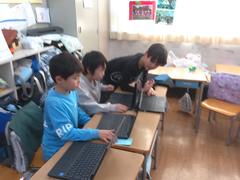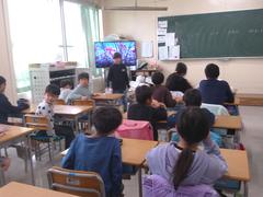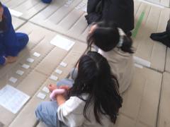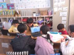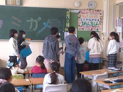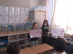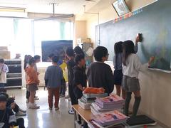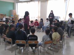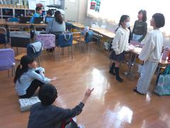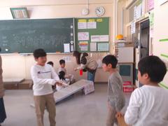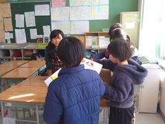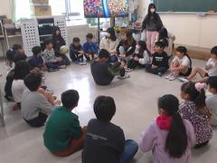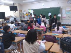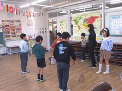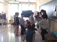 幼稚園、保育園の園児が小学校に来ました。1年生たちは、園児に学校のことを一生懸命教えていました。