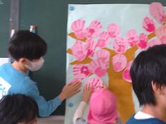 5年生は園児に優しく教えながら作業を進めていました。きれいな花がたくさん咲いた掲示物が完成しました。
