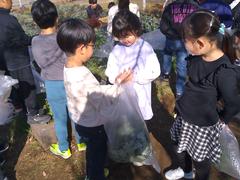 小松菜がビニール袋いっぱいとれました。子どもたちはスープにいれるか、炒めるかなど、どのように調理しようかわくわくしながら悩んでいました。