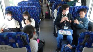車内で出発式を行い、修学旅行のスローガンをみんなで確かめました。
