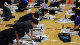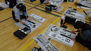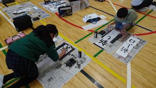 4年生は体育館に学年全員が集い、一斉に書き初めを行いました。