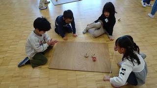 けん玉、こま回し、お手玉、あやとりの4つの場をローテーションして回りました。