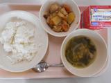 ごはん、牛乳、茎わかめの佃煮、肉じゃが、みそ汁