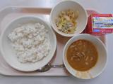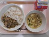 大豆ミートのキーマカレー、むぎごはん、牛乳。白菜とじゃこの炒め煮