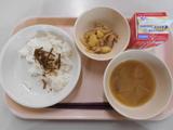 高野豆腐のそぼろごはん、牛乳、キャベツのおかかあえ、けんちん汁