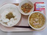 高野豆腐のそぼろご飯、牛乳、うめきゅうり、春雨スープ