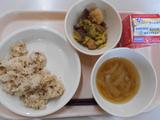 高野豆腐のそぼろごはん、牛乳、ごまきゅうり、けんちん汁