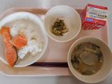 ごはん、牛乳、鮭の塩焼き、白菜のおかかあえ、めった汁