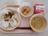 ごはん、大根の葉のふりかけ、牛乳、鶏肉のからあげ、豆乳中華スープ