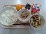 ごはん、牛乳、焼き海苔、さつまあげと冬やさいの煮物、もやしのうま煮、みかん