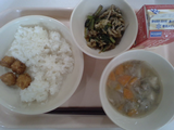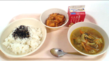 ごはん、牛乳、めかじきの竜田あげ、磯かあえ、豚汁