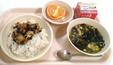鶏にら丼、牛乳、わかめとコーンのスープ、カラマンダリン