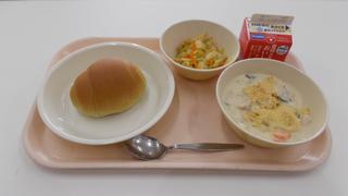 2月10日の給食は、能登復興応援メニューとして、「中島菜ロールパン」が提供されました。中島菜は、能登半島の七尾市中島町を中心に栽培されてきた伝統的な野菜です。中島菜の粉末をパン生地に練り込んで焼きました。パンを割ってみると、生地がほんのり緑色で、見た目にも美味しそうなパンでした。