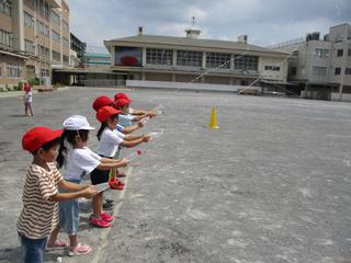 9月の生活科「なつがやってきた」では、これまでの水遊びの経験をもとに話し合い、よりよく楽しめる方法を考え、実践しました。思い思いの遊び方で夏の良さを味わっていました。