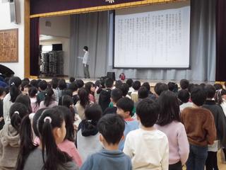 音楽委員さんの指揮で体育館に歌声が響きます。覚えて歌ってみましょう!