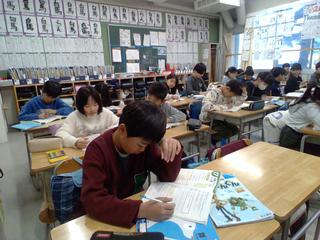 これは、3年生の読みかせの風景です。みんな、この時間が大好きです。