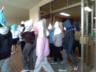 教室にいた子供たちは、防災頭巾をかぶって避難します。