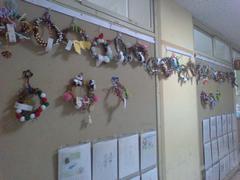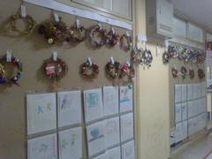 完成したリースは各クラスで廊下に飾っています。少し薄暗い廊下が、リースのおかげで華やかになりました。