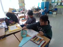 2年生と5年生の子どもたちは、交流級で行う図工の作品を作っています。