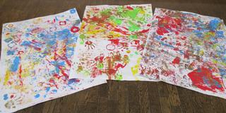 図工の「ぺったん コロコロ」の学習で、身近な材料に絵の具をつけて、大きな模造紙にぺったん、コロコロしました。図工室で、グループごとに協力しながら「この模様がおもしろいね。」「次はこれでやってみようよ。」と、偶然できた形や色に喜び、友だちと一緒に楽しんで活動していました。