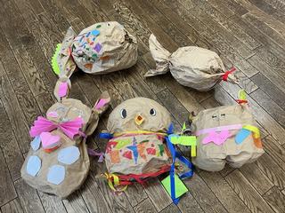 大きな紙袋の中に紙を入れて膨らませ、ぎゅっと紐で縛って、耳にしたり頭にしたりする中で、「どんな生き物に見えるかな」と何度も形を変え試行錯誤しながら、作品作りに取り組んでいました。縛り方や材料の使い方を工夫することで、色々な生き物を作ることができました。