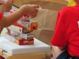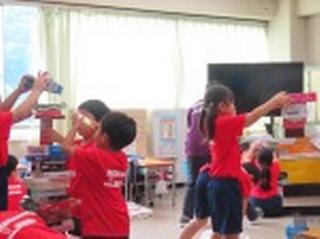 1年生はハコを積み上げていました。面と面が垂直の関係だと安定するという図形領域の基礎となる経験。そぉっと積み上げる真剣なまなざしが可愛い。