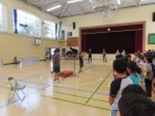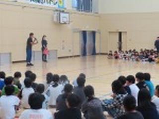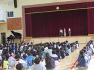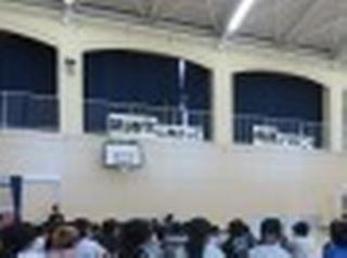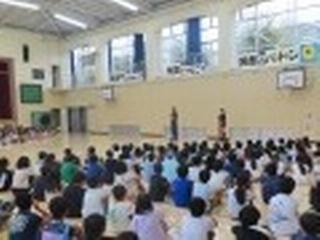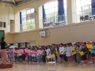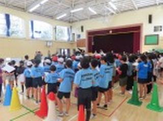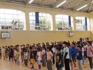 今日の朝会は、創立40周年式典の会場イメージをもつために、全校の子どもたちが南向きに並んでみました。ちょっと新鮮な雰囲気での10月のスタート。