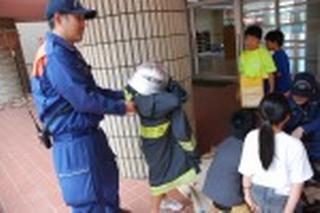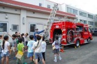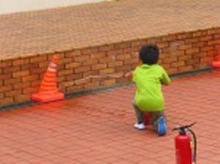 子どもたちに様々な説明をしてくださるだけでなく、消防服を試着させていただいたり、消火器の使い方を教えてくださったり。