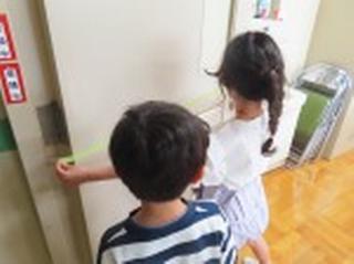 2年生たちが(1mごとの目盛りがついた)3mのめもりテープをもって、校舎内の長いものを測っていました。