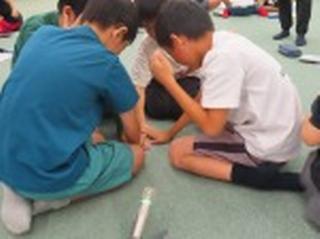 1mのテープをもって、2年生たちが「1mピッタリのものはないかな」と校舎内を探し回っていました。