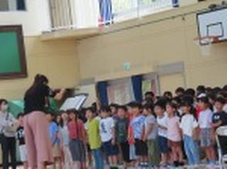 全校のみんなで音楽の授業をしました。久しぶりに歌った校歌はちゃんと掛け合いになっていて、歌詞にある通り、「あの森を越えて♫」行きました。