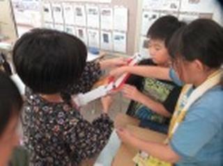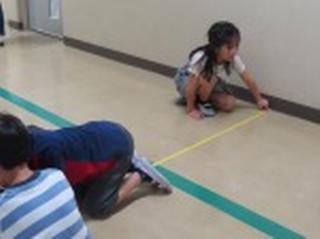2mめもりテープに半端があると、半端の分は30cm竹尺で測って、たし算をします。結構大変。協力しながら、頭をフル回転させて、長さを求めていました。
