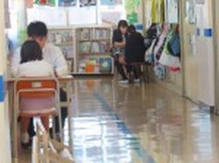 今日の3・4時間目の6年生たち。それぞれのグループが校内のあちこちの活動しやすい場所で、総合的な学習のまとめをしていました。