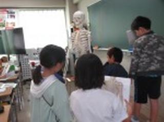 もちろん、骸骨(骨格の模型)には、みんな興味津津。腕の曲げ伸ばしの筋肉模型と見比べながら、なかやまきんに君さながらに「パワ~」と自分の力こぶを作っていました。「あのね、(担任の)先生の力こぶがすごいんだよ」とそっと教えてくれた子もいました。