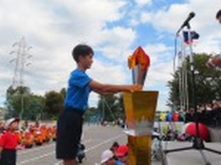 聖火リレー→聖火台に設置。この聖火は、去年の運動会で、6年生(現中1の卒業生)から5年生(現6年生)が受け取ったものです。