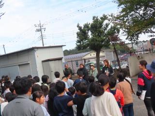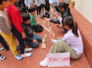 本校建設の際に発見されたヤジリ・狩りで使用した落とし穴跡…「南原遺跡」と名付けられたこの場所。4000年前の縄文時代には、この地で人々が狩りをするなどして暮らしていたことを全校のみんなに伝えるべく、6年生が今日の中休みに「ミニ体験イベント」を開催していました。